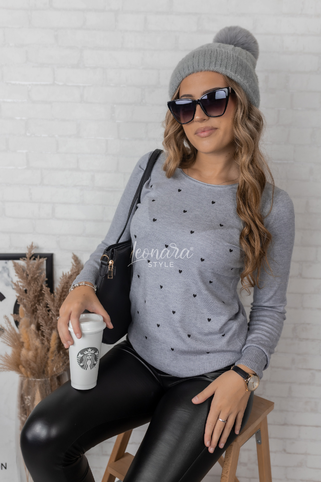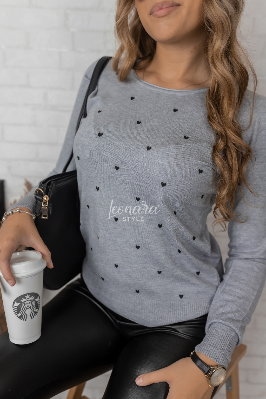Romantický kousek, který rozzáří každý outfit. Svetřík s dlouhým rukávem je zdobený drobnými srdíčky a vyrobený z příjemného, hebkého materiálu, který se pohodlně nosí po celý den. Díky jednoduchému střihu se skvěle kombinuje jak s džínami, tak i se sukní či koženkovými kalhotami.