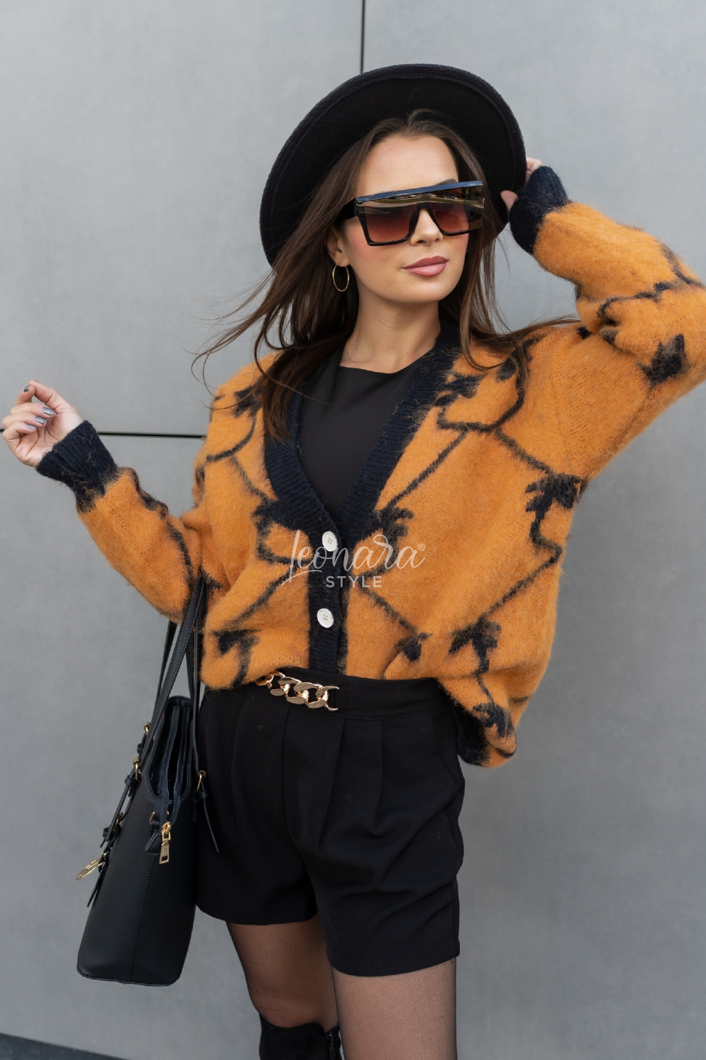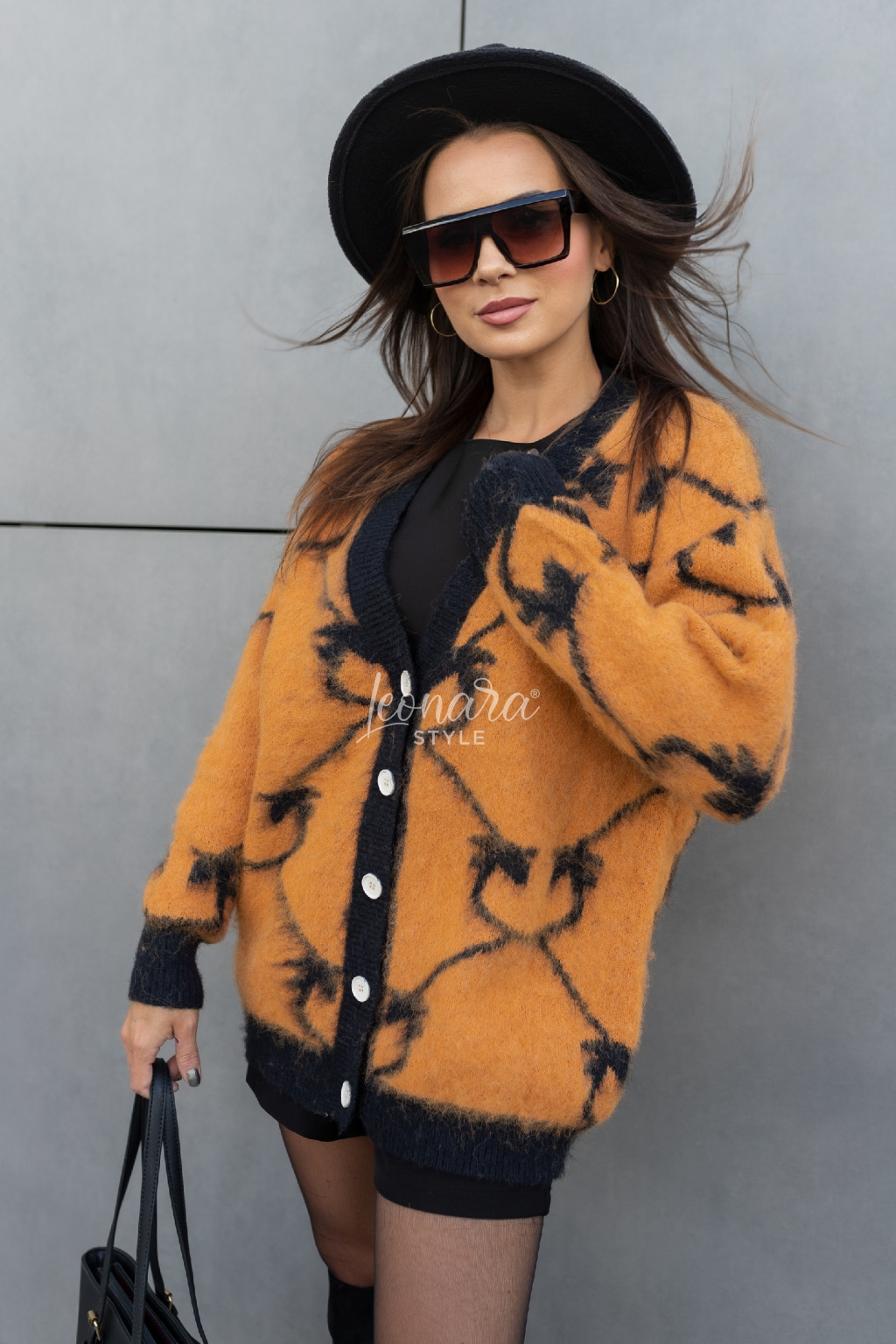 Huňatý propínací kardigan na knoflíky. Výrazný kontrastní vzor dodává kousku originalitu, lemování a manžety jsou v odlišném odstínu. Díky své měkké a příjemné struktuře je ideální na chladnější dny, působí hřejivě a stylově zároveň. Tento typ svetru se hodí jak k džínům, tak i k sukni či šortkám pro ležérní, ale stále elegantní look.