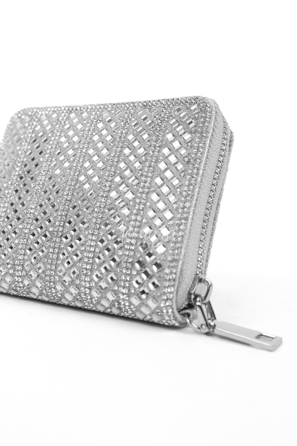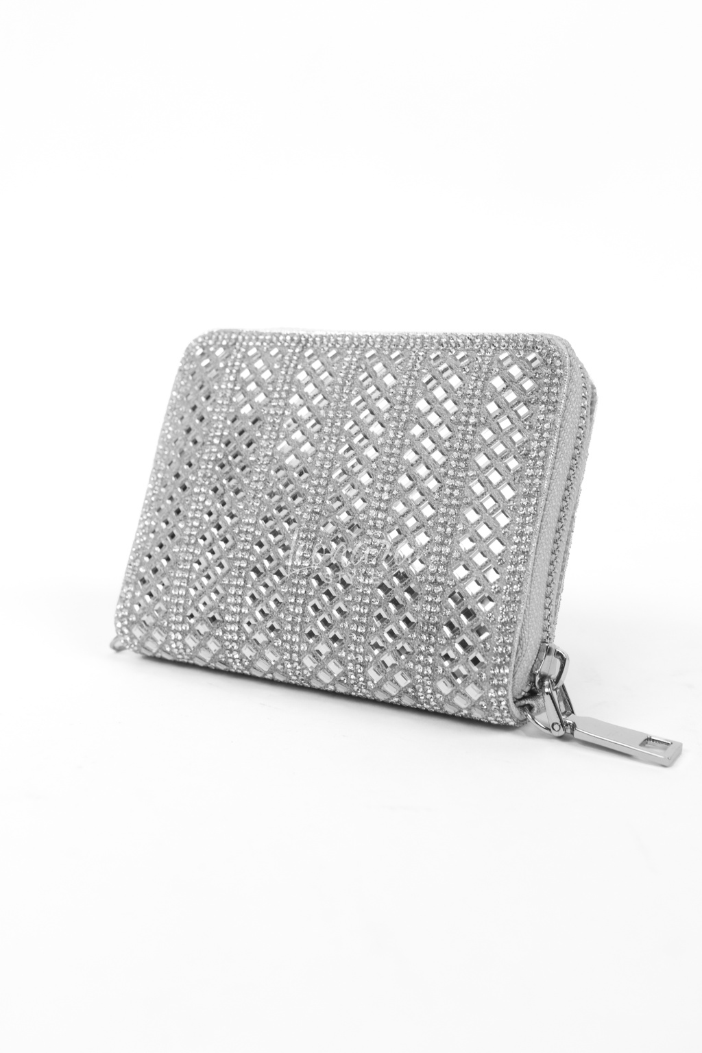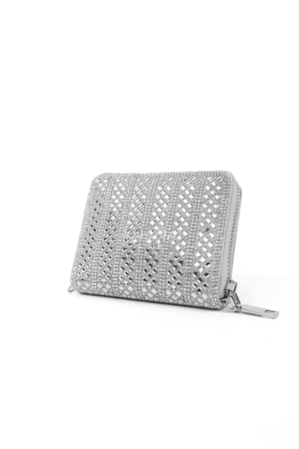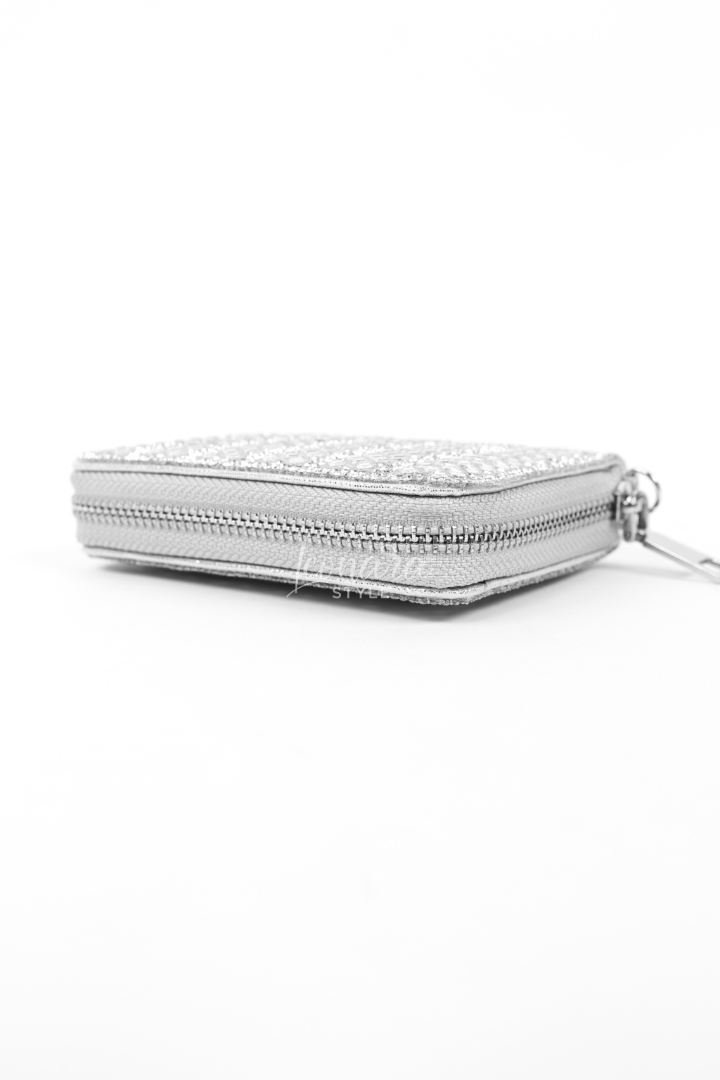 Tato třpytivá peněženka je nepřehlédnutelným doplňkem, který zaujme na první pohled. Je zdobena jemnými kamínky. Zapínání na zip zajistí bezpečné uložení všech vašich nezbytností. Uvnitř najdete čtyři menší kapsy na věrnostní karty a dvě oddělené přihrádky pro přehledné uspořádání bankovek či dalších dokladů. Ideální pro každodenní nošení i speciální příležitosti.