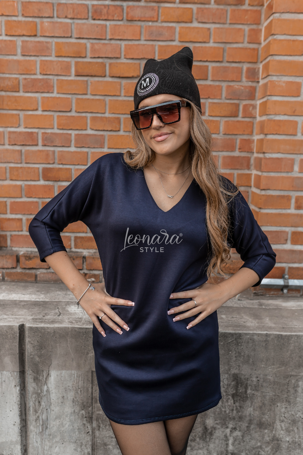 Tmavě modrá tunika s výstřihem do V a 3/4 rukávy je univerzální kousek, který snadno doplní každý šatník. Měkký, příjemný materiál splývá volně kolem těla a vytváří pohodlný střih, který lichotí postavě a zároveň poskytuje volnost pohybu. Tunika má dvě kapsy na stranách. Výstřih do V přidává elegantní prvek a jemně prodlužuje siluetu, zatímco 3/4 rukávy dodávají tunice moderní vzhled, který je ideální pro každodenní nošení i neformální příležitosti. Tmavě modrý odstín působí elegantně a snadno se kombinuje s různými doplňky či barvami. Tuniku lze snadno sladit s džínami, legínami nebo nosit i jako šaty se silonkami. Pásek není součástí!