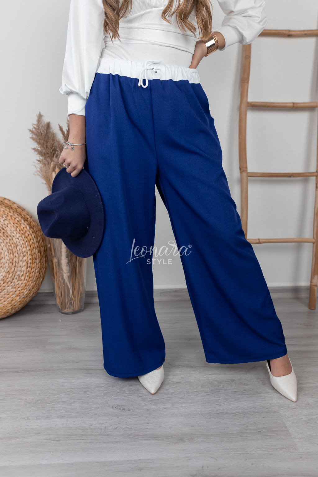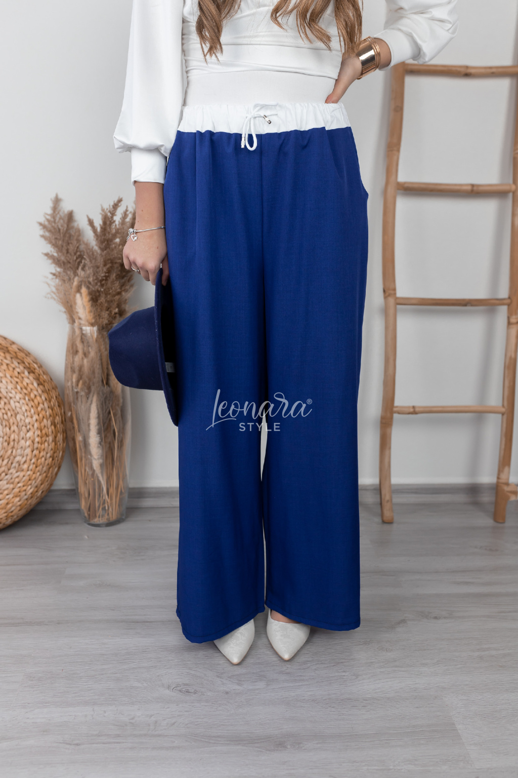 Elegantní široké kalhoty, které spojují pohodlí a styl. Díky lehkému materiálu jsou vhodné i pro letní období a příjemně se nosí po celý den. V pase mají pružnou gumu pro snadné přizpůsobení postavě a šňůrku na zavazování, kterou lemuje bílá látka jako jemný a zajímavý detail. Kalhoty mají praktické kapsy a volný střih, který působí vzdušně a zároveň elegantně. Skvěle se hodí na běžné nošení, do práce i na společenskější události.
