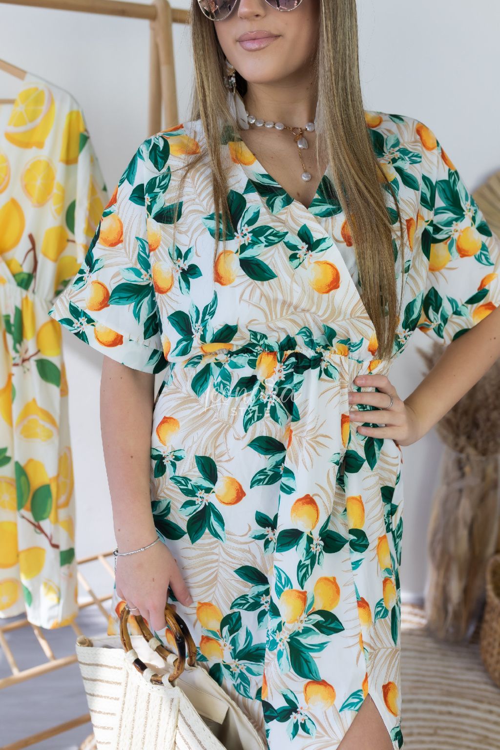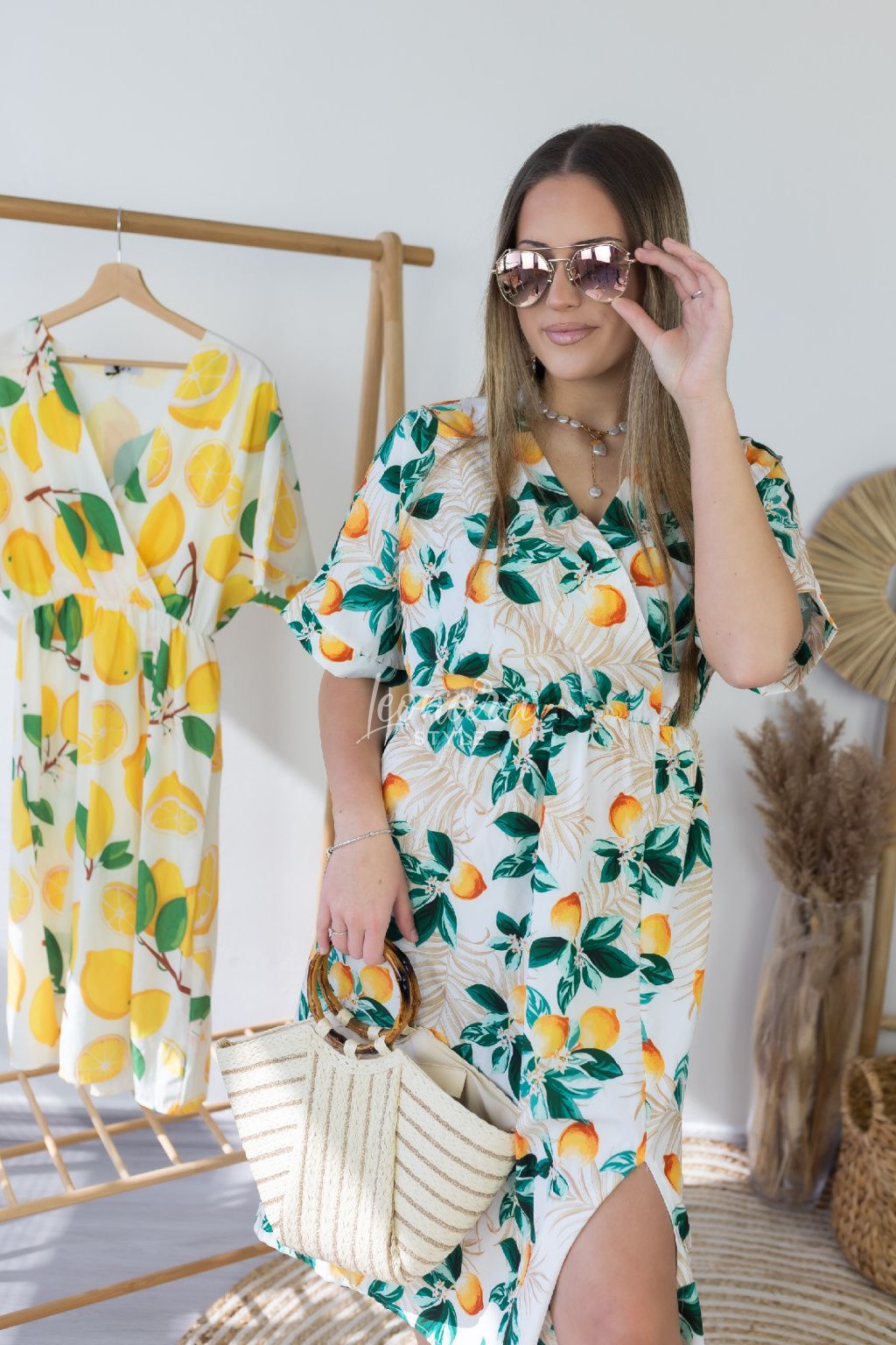 Nádherné citrónkové šaty s lichotivým střihem, které si zamilujete pro jejich pohodlí a ženský styl. Jejich dominantou je drobný, propracovaný citronový vzor na bílém podkladu. Šaty mají véčkový výstřih, který krásně prodlouží šíji, mají polodlouhé rukávy. V pase je všitá guma, díky které se model skvěle přizpůsobí vaší postavě a zvýrazní siluetu. Sukně je doplněna o rafinovaný rozparek na boku, který dodává celku lehkost, moderní šmrnc a volnost při pohybu. Hladký a splývavý materiál zaručuje maximální komfort.