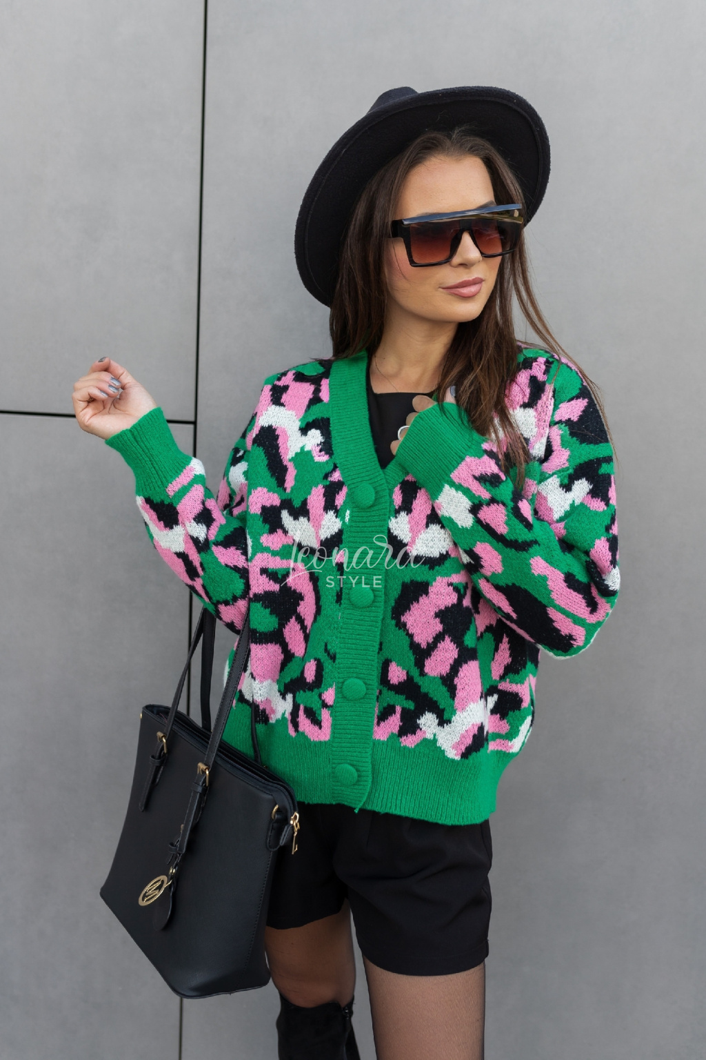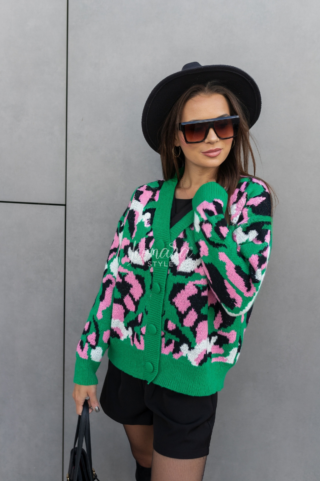 Výrazný dámský svetr na zapínání s barevným vzorem v kombinaci zelené, růžové, bílé a černé. Má volnější střih, výstřih do „V“ a zapínání na knoflíky ladící v barvě lemu. Díky pestrému designu oživí každý outfit a působí mladistvě a hravě. Skvělý k džínám i jednobarevným kalhotám.