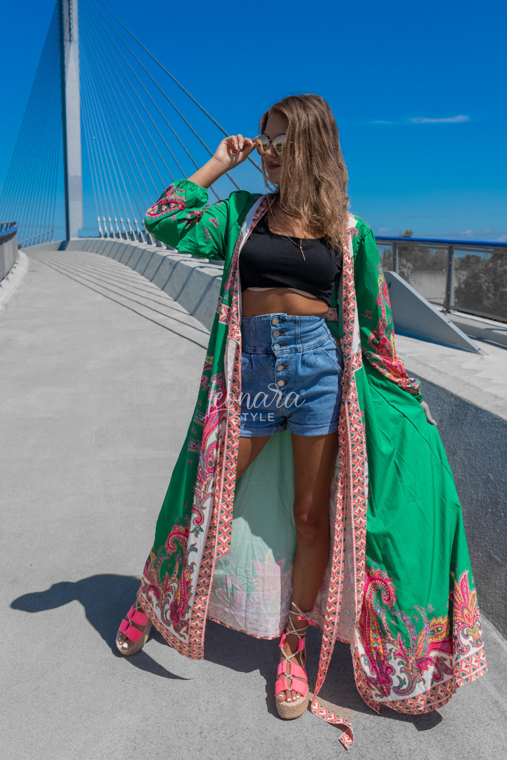 Stylový dlouhý přehoz s orientálním vzorem vyniká sytou zelenou barvou a výraznými detaily v růžových a bílých tónech. Lehký a vzdušný materiál je ideální na pláž, k bazénu nebo jako doplněk k letnímu outfitu. Díky volnému střihu a zavazování v pase se pohodlně nosí a snadno kombinuje – ať už přes plavky, nebo třeba s kraťasy a topem.